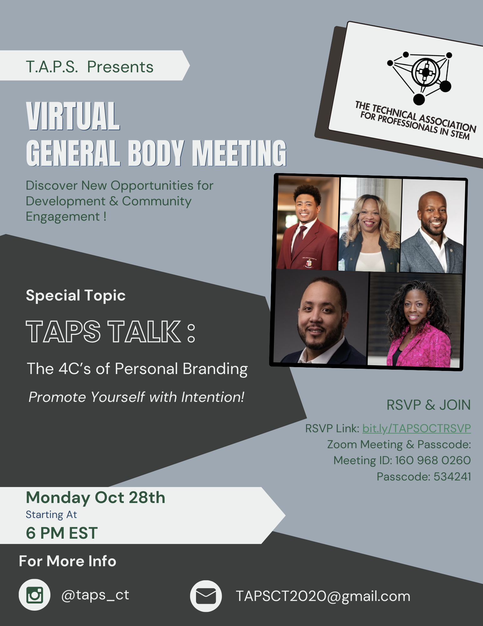 The Technical Association for Professionals in STEM runs a professional development series called “T.A.P.S. Talks”. During a T.A.P.S. Talk, experts and experienced professionals share particular expertise with our membership. Topics range from career advancement, life building, and work-life balance coaching. See some of our more recent workshops below!